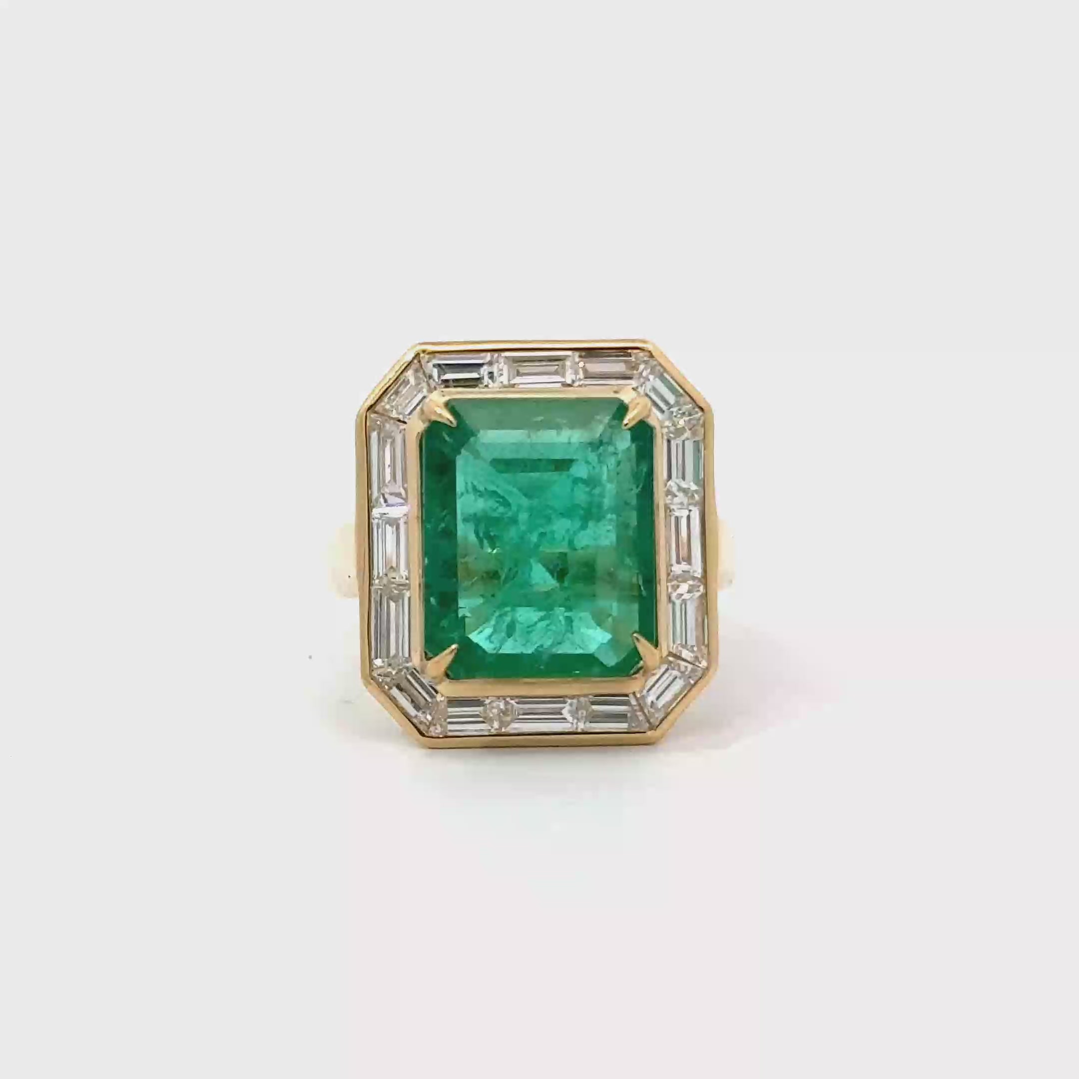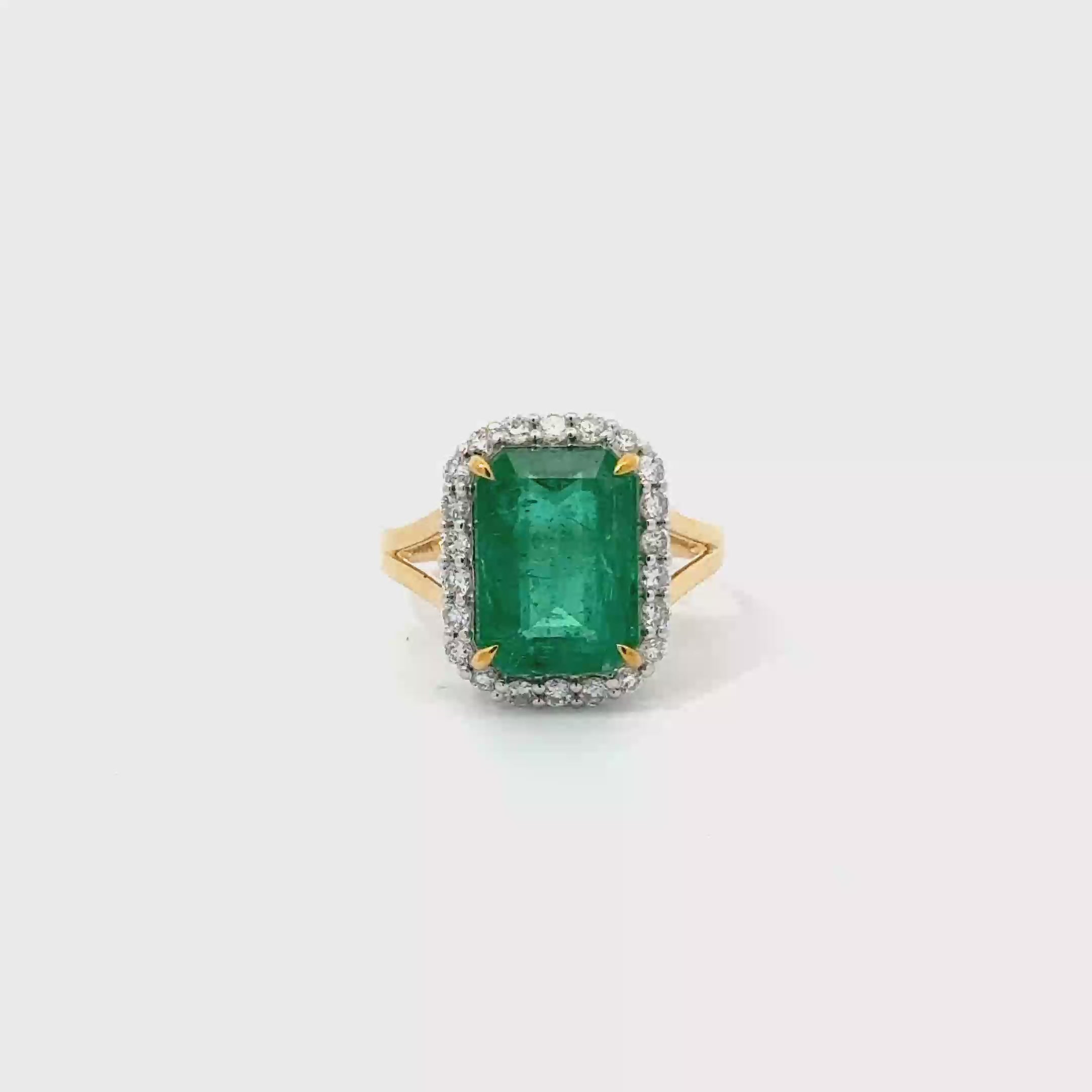 18 KARAT EMERALD AND DIAMOND HALO RING