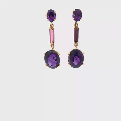 Adding a splash of color to your collection, these stunning earrings feature a beautiful combination of purple amethyst and pink tourmaline elegantly prong set in 14k gold. The design showcases a mix of oval and rectangular shapes, creating a sophisticated look perfect for any occasion. Finally the perfect summer wedding guest accessory. Elevate your style with these eye-catching accessories that add a touch of luxury and fun to your outfit.