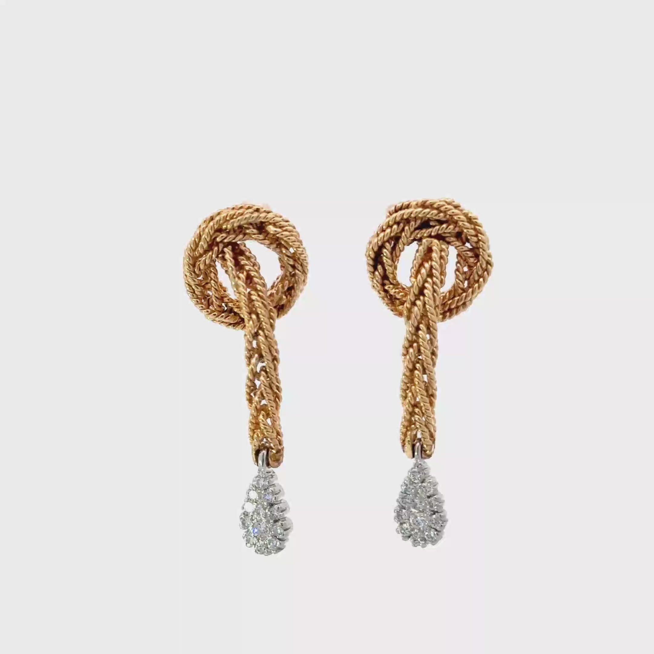 Discover the allure of these vintage stunning gold and diamond earrings, designed to elevate any outfit. The intricate woven knot gold design adds a touch of sophistication, while the sparkling diamond drops provide a dazzling finish. Perfect for both casual and formal occasions, these earrings are a must-have accessory for any jewelry lover.