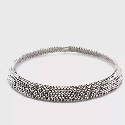 Elevate your style with this sleek Estate 14K white gold woven chain collar. Showcasing Italian gold workmanship, this necklace is durable and made for timeless wear. The woven design adds a touch of modern sophistication, making it perfect for both casual and formal occasions. It's polished finish ensures a lasting shine, enhancing your overall look with subtle elegance. Style with a crisp white button down or sleek black dress; this collar will soon become your go to statement piece.