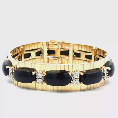 Elevate your style with this exquisite vintage 14k gold chain bracelet with a center row of prong set oval shaped onyx and round brilliant cut diamonds. The onyx provides a bold contrast against the warm gold, creating a statement piece that exudes sophistication and elegance. Perfect way to dress up and any evening ensemble.