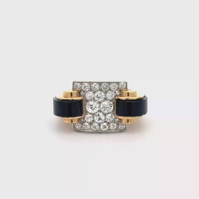 Discover the timeless elegance of this retro vintage diamond ring, featuring a stunning arrangement of sparkling diamonds set against a polished onyx. The unique design combines classic sophistication with modern flair, making it a perfect accessory for any occasion.
