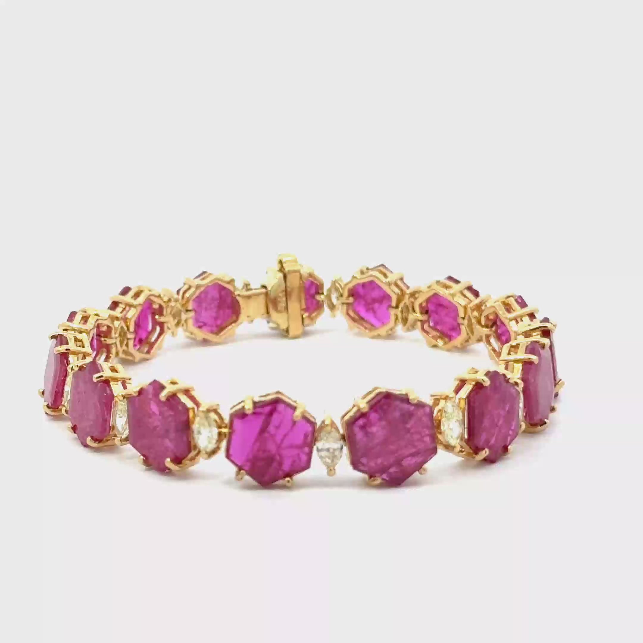 Elevate your ensemble with this stunning 18 karat yellow gold ruby and diamond bracelet. It showcases delicately table cut, hexagon-shaped rubies with a vivid pink-purple translucent hue. Marquise diamonds sit mounted between rubies for a striking contrast.