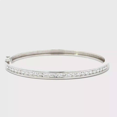 Elevate your style with this chic 18 karat white gold and diamond bangle. The white gold setting enhances the fire and scintillation of each carefully channel-set diamonds. This timeless bangle embodies sophistication and adds a touch of luxury to any ensemble.
