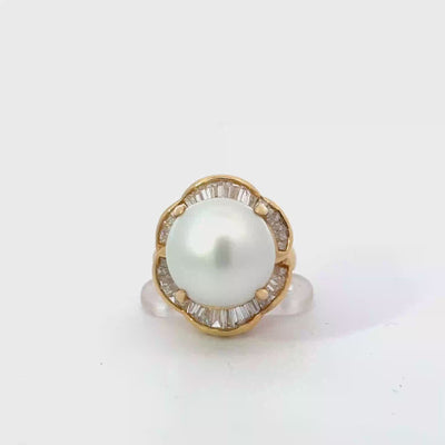 A stunning 18 karat yellow gold pearl and diamond estate cocktail ring. Features a center lustrous South Sea Pearl surrounded by a halo of sparkling baguette cut diamonds. The free form design and warm gold setting make it a perfect accessory for any occasion, adding a touch of elegance to your ensemble.
