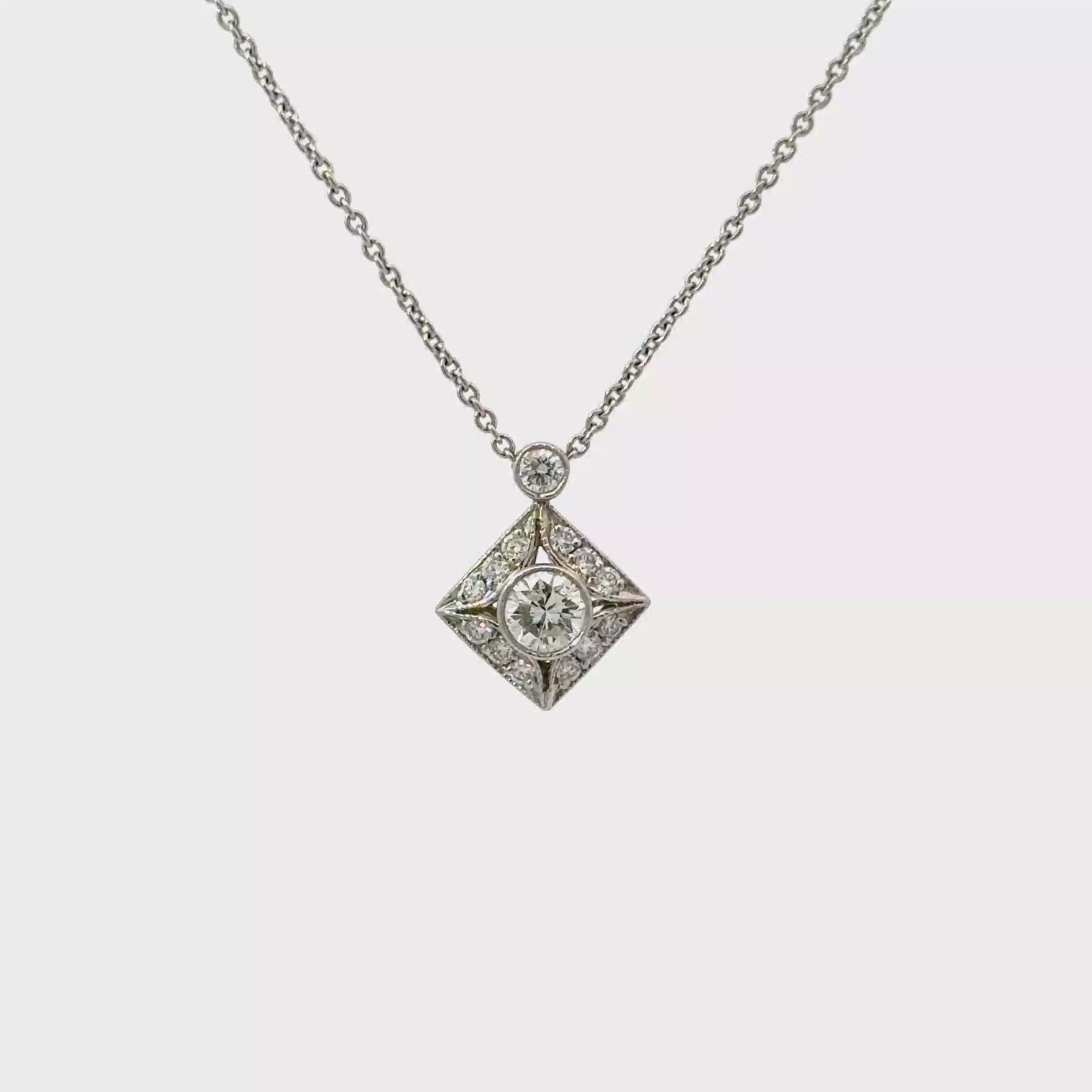 Add a delicate old world touch to your style with this exquisite platinum and diamond necklace; a timeless piece featuring a brilliant round cut diamond at its heart. A symbol of enduring elegance and refined taste, this necklace is perfect for adding a touch of luxury to any ensemble.