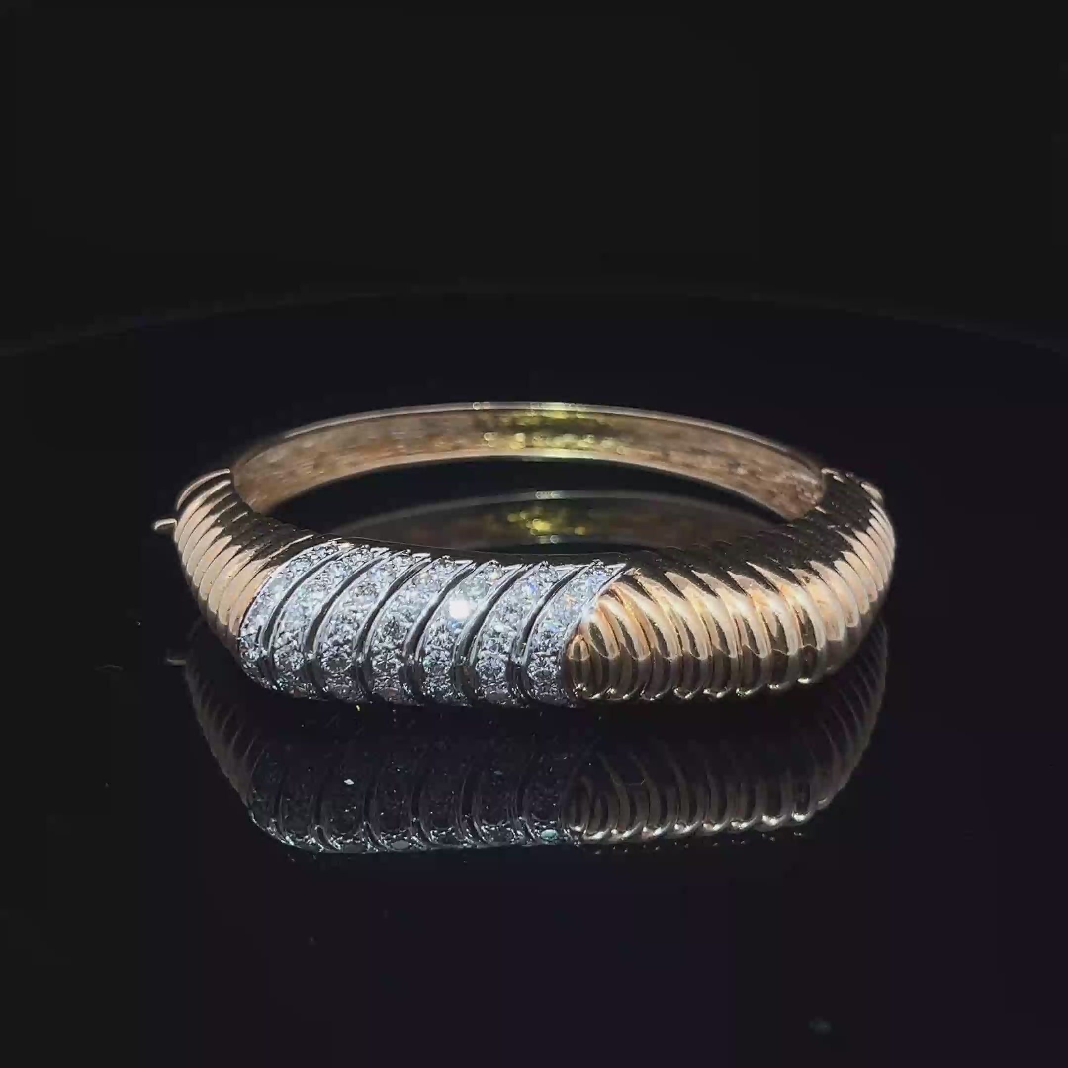 This exquisite 14 karat gold hinged bracelet showcases a refined blend of elegance and sophistication with its two toned gold and domed design. Adorned with shimmering diamonds, it adds a touch of luxury to any ensemble. Perfect for special occasions or adding glamour to everyday wear.