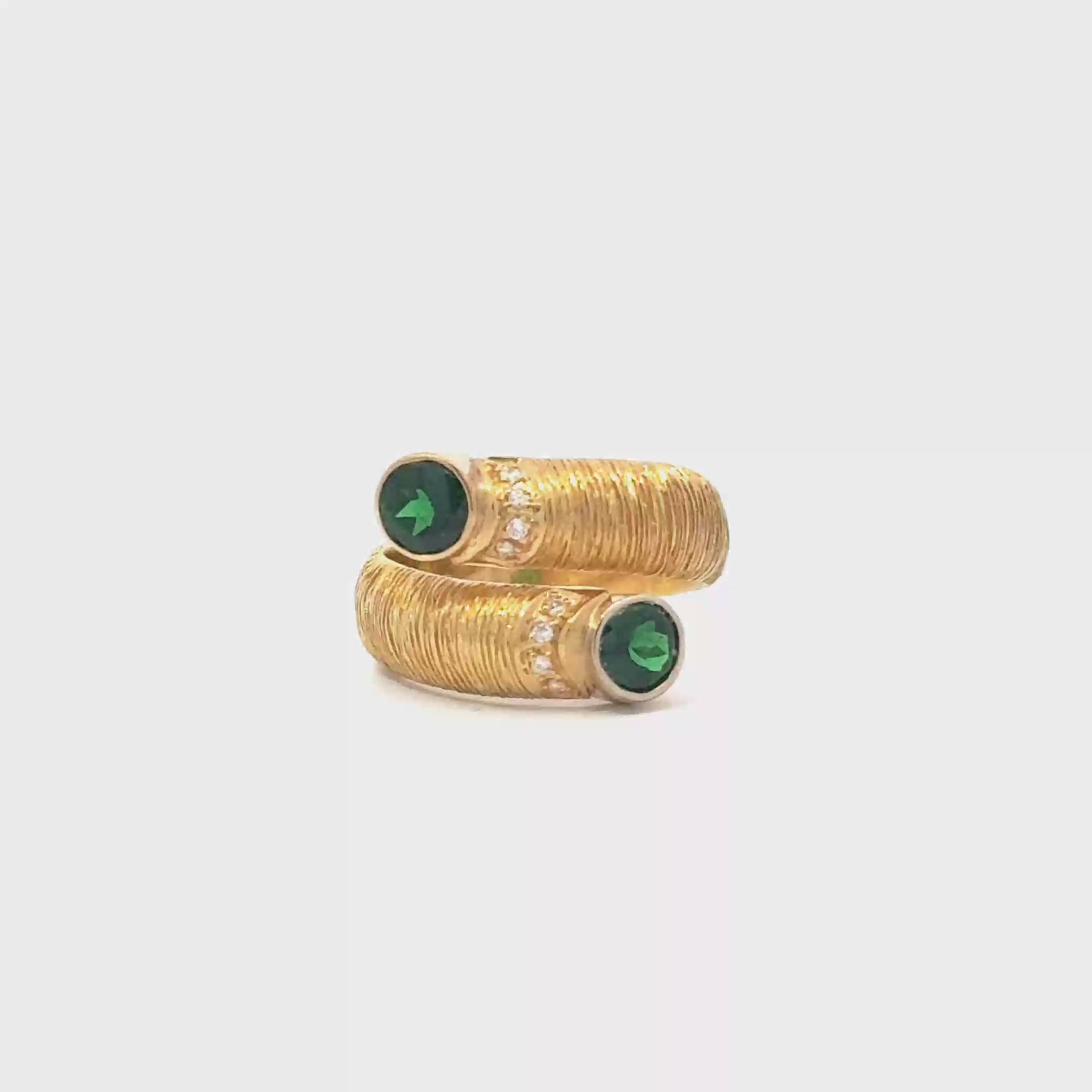 Discover the allure of this stunning 14 karat tsavorite and diamond gold ring. A vintage take on the "Toi et Moi" style featuring intricate twisted detailing that adds a unique touch to any outfit. A perfect statement piece for both casual and formal occasions.