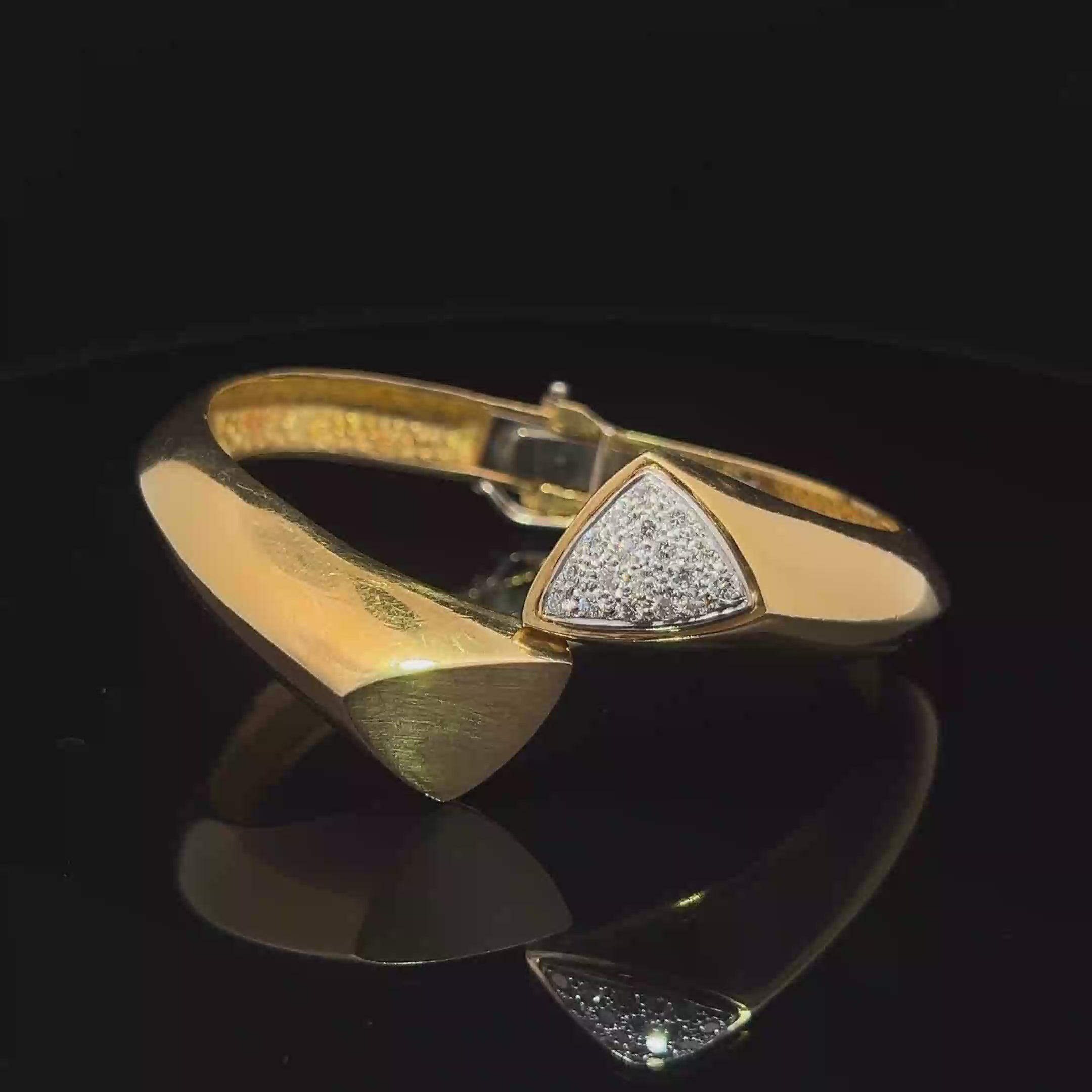 This exquisite vintage 18K gold bracelet features a stunning triangular form and pave diamond accents. The polished finish and modern design make it the perfect accessory for any sophisticated look.