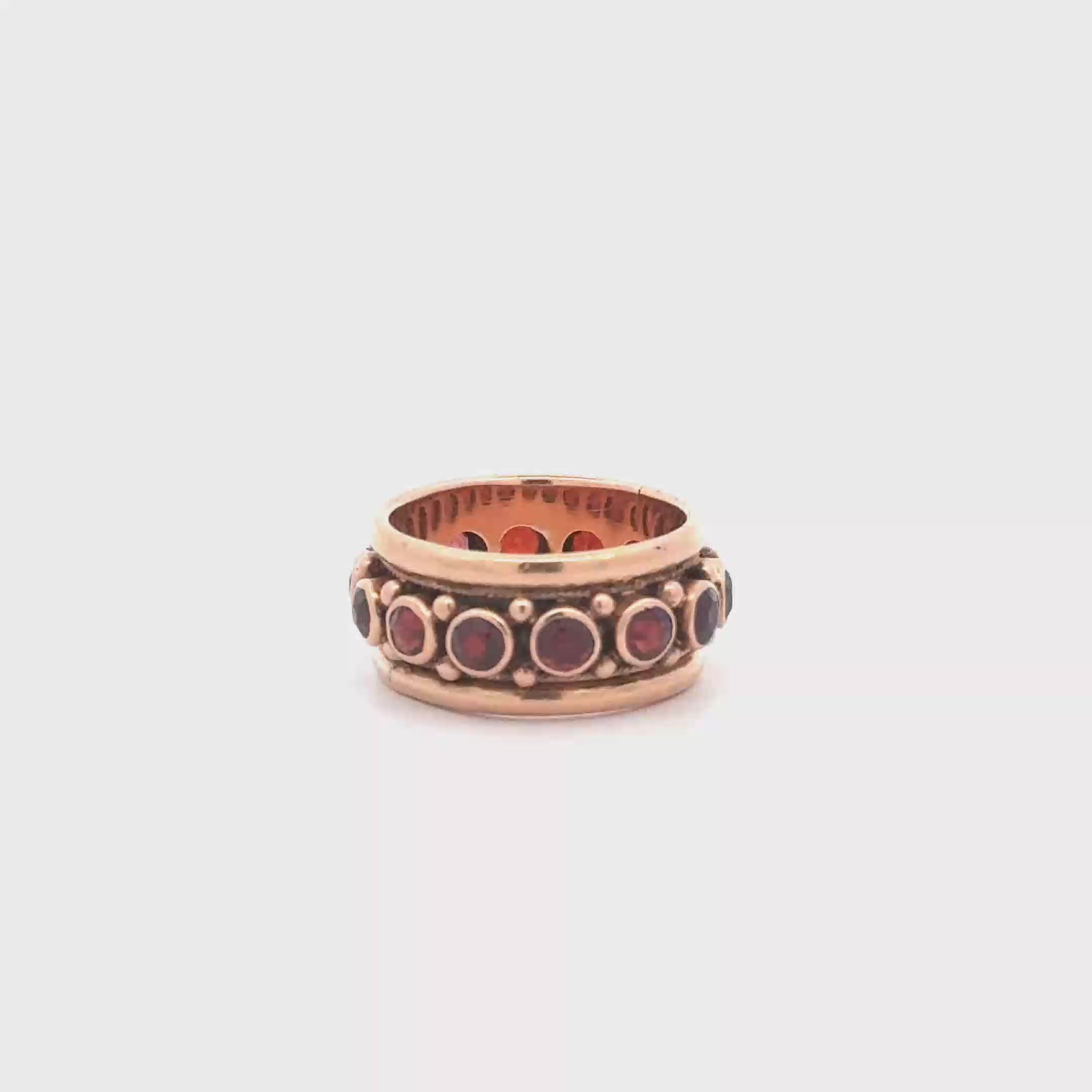 Discover the allure of this exquisite garnet bezel-set ring. Crafted with precision, this 14 rose gold ring features a stunning array of deep red garnets set in a delicate band, making it a perfect accessory for any occasion. Whether worn alone or stacked with other rings, this piece adds a touch of elegance to your jewelry collection.