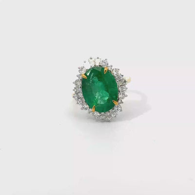 Indulge in the enchanting allure of this gold cocktail ring, showcasing a mesmerizing 6.37 Zambian oval emerald. Its lush green hue exudes sophistication and grace, perfect for adding a touch of vibrant elegance to any ensemble. A true statement piece for the discerning jewelry lover.