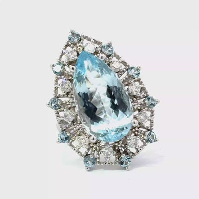 Part of our "Something Blue" Bridal Capsule. Indulge in the allure of this captivating vintage aquamarine and diamond 14 karat white gold cocktail ring. The mesmerizing pear-shaped aquamarine, with its enchanting blue hue, takes center stage. The dreamy translucent gemstone adds an air of mystique to this bold ring. A statement piece to elevate your evening attire.