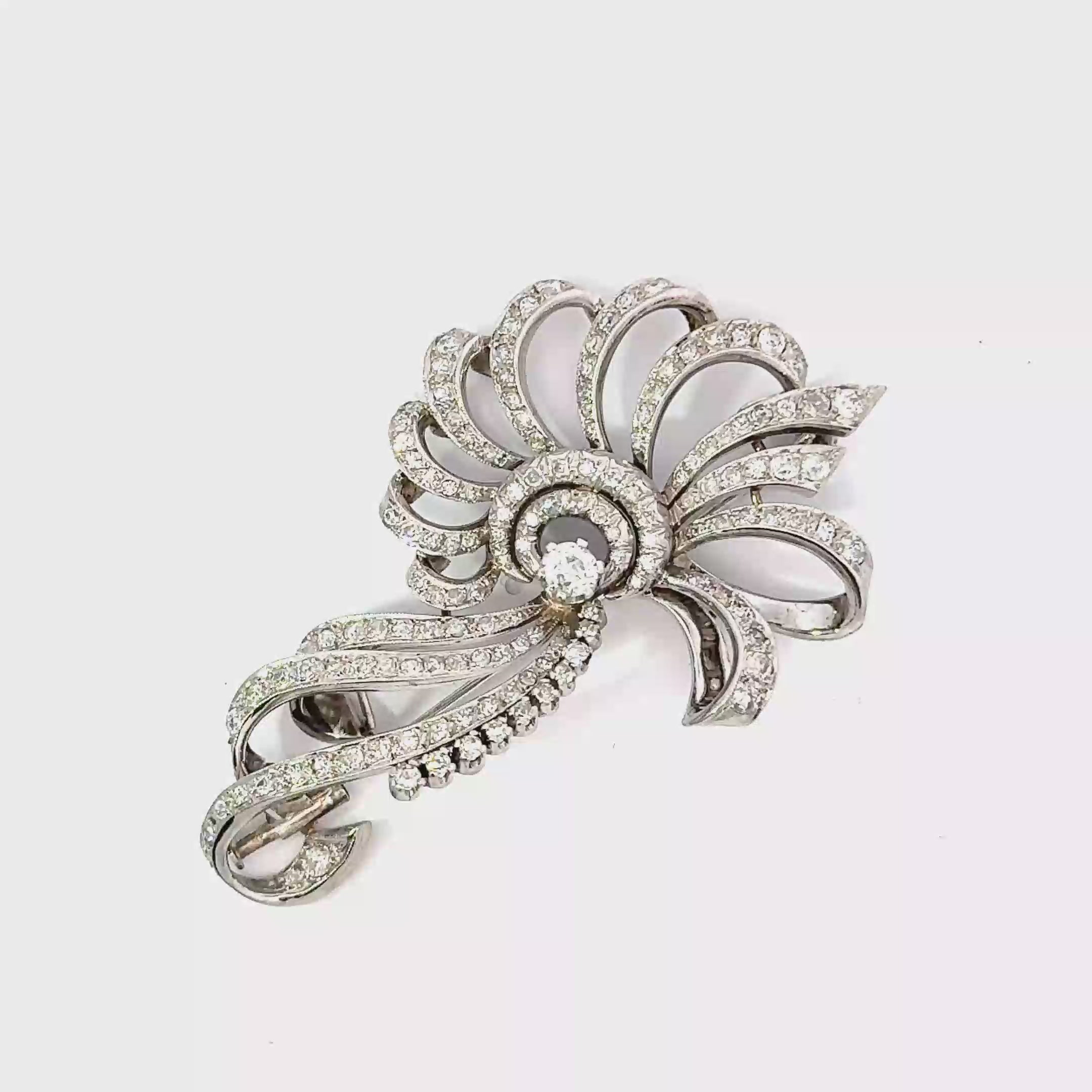 This stunning antique retro platinum diamond brooch features an intricate design that mimics the graceful curves and lines representative of the period. Adorned with sparkling diamonds, it captures light beautifully, making it a perfect accessory for any formal occasion especially bridal events. Whether pinned to a dress or a jacket, this brooch adds a touch of elegance and sophistication.
