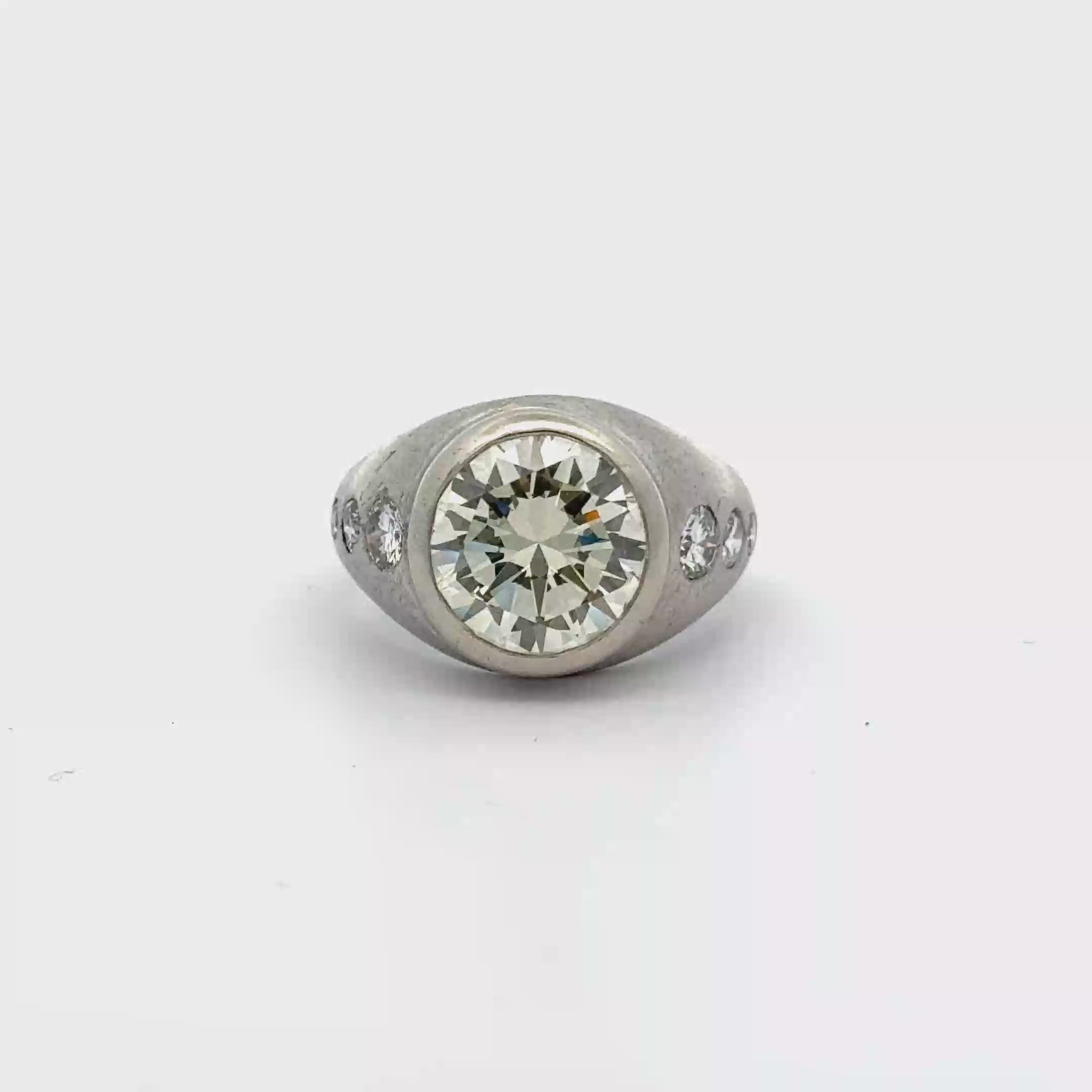 Diamond: Approximately 3.97 carats [N/VVS-2]; Accented by six flush round cut diamonds totaling 0.54 carats [H/I-1]