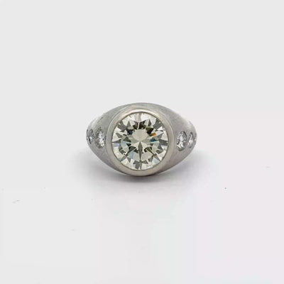 Elevate your style with this meticulously crafted platinum signet diamond ring featuring a 3.97 carat transitional cut diamond. It features a brilliant-cut, round diamond, exuding timeless charm and sophistication. The classic design showcases a seamless fusion of elegance and modern aesthetics, making it a distinguished accessory for any occasion.