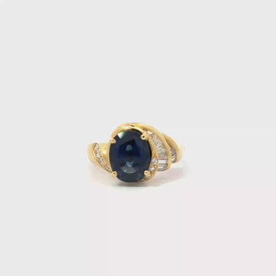 Elevate your ensemble with this exquisite 4.18 carat deep blue sapphire ring . The oval cut sapphire is gracefully set in a radiant yellow gold band with diamonds radiating outwards, creating a harmonious blend of color and texture. Part of our Something Blue Capsule Collection; a timeless piece that exudes sophistication and style.