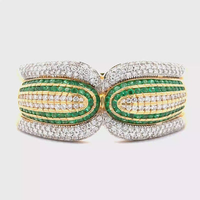 A true conversation piece. Mark your style with this exquisite 18 karat yellow gold, diamond and emerald bracelet. This piece features round colorless diamonds with brilliant cutting style alongside vibrant green round emeralds in a classic duo domed fashion. A harmonious blend of sparkle and color, creating a timeless accessory.